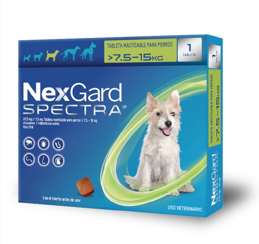 NexGard Spectra 7.6–15 kg (M) es un antiparasitario oral de amplio espectro para perros medianos que proporciona control simultáneo de parásitos externos e internos mediante una tableta masticable de administración mensual. Es un endectoparasiticida que combina dos principios activos, afoxolaner y milbemicina oxima, diseñados para eliminar pulgas y garrapatas y tratar o prevenir infestaciones por nematodos gastrointestinales y dirofilariosis.